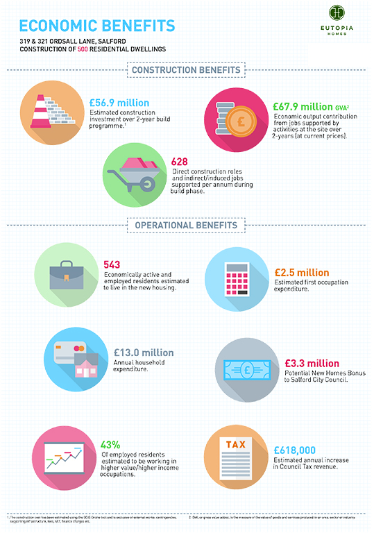 The development relates to the redevelopment of 319 and 321 Ordsall lane to deliver 500 residential units, made up of a combination of 1, 2 and 3 bedroom apartments. The scheme will deliver associated on site car parking, cycle storage, amenity space, landscaping and access.